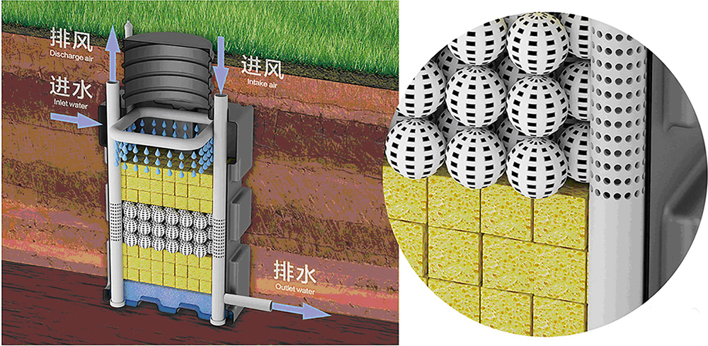 該設備打破傳統污水處理廠工藝設計,采用自然通風氧化工藝和多孔掛膜生物體與滲濾技術相結合。將沉淀區、厭氧區、好氧區、過濾區等多區段,組合在同一體化罐內,具有兼氧、好氧和BAF生物過濾等功能。即使是嚴寒地區的冬季,出水水質也可以達到國家分布式生活污水的排放標準。嚴寒地區可采用太陽能熱風增溫,太陽能光電作為強制通風及高位排水的動力。