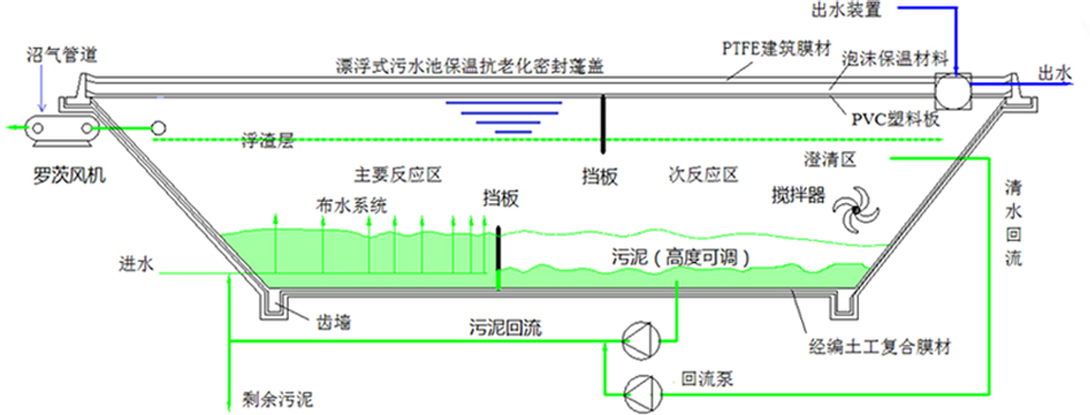 LS-EA低速高效厭氧反應器是現代建筑膜材和先進的厭氧反應控制理論相結合的成果,實現了污水處理的資源化利用。反應器池體為長方梯形結構,池型特點滿足厭氧反應器內水力推流攪拌和固、液、氣的分離的需要,復合膜材料作為防滲材料無需要專用三相分器,無需復雜的布水回流系統,出水沉淀區確保出水固液分離。