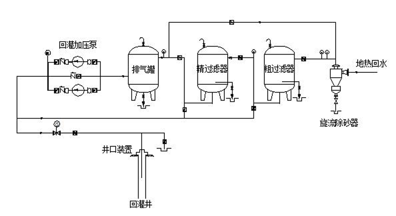 地熱水回灌整體機組,主要是由除砂器、粗過濾、細過濾、排氣罐、加壓泵及自動化控制系統組成一體。